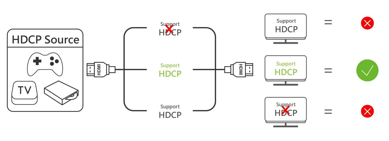 미라캐스트를 이용해 넷플릭스, Tving 등의 DRM이 걸려 있는 영상을 시청하기 위해서는 대상 TV가 HDCP (고대역 디지털 콘텐츠 보호)라는 저작권 보호 기술을 지원해야 합니다. HDCP를 지원하지 않는 경우 DRM이 걸려 있지 않은 일반적인 핸드폰 사용이나 유튜브 영상 시청 등은 가능하지만, 넷플릭스, 왓챠플레이 등을 통한 영상 시청이 불가능하므로 반드시 미리 이 사항을 확인해두어야 합니다. 간혹가다 미라캐스트 제품 자체도 HDCP를 지원하지 않는 경우가 있으므로 미라캐스트 제품 자체에 대해서도 확인을 하도록 합시다. 물론 이런 영상을 볼 용도가 아니라면 신경쓰지 않으셔도 좋습니다.