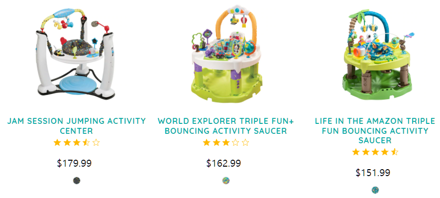 - 엑서쏘서 트리플펀 아마존 (Life in the amazon triple fun bouncing activity saucer) : 맘카페에서 가장 유명한 제품인데, 현재 국내에는 정상가로 판매되는 신상품은 대부분 품절인 것으로 보입니다. 구하기가 어렵습니다. (일부 판매하는 곳이 있긴 하나, 18만원 이상으로 판매되는 것은 너무 바가지 쓰는 것이므로 구매하시지 않는 것이 낫다고 보여집니다.)