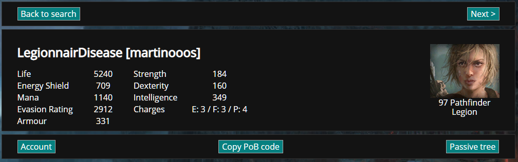 우선 POE ninja에 접속하여 마음에 드는 빌드를 찾아봅시다. POE ninja에서 마음에 드는 빌드를 선택하셨다면, 해당 계정으로 들어가서 PoB Code를 복사해줍니다. 아래 사진에서 보이는 [Copy PoB code] 버튼을 선택하시면 자동으로 코드가 복사됩니다. 버튼을 선택하면 버튼의 이름이 [Copied PoB code]라고 표시될 겁니다. 그러면 정상적으로 코드가 복사된 것입니다.